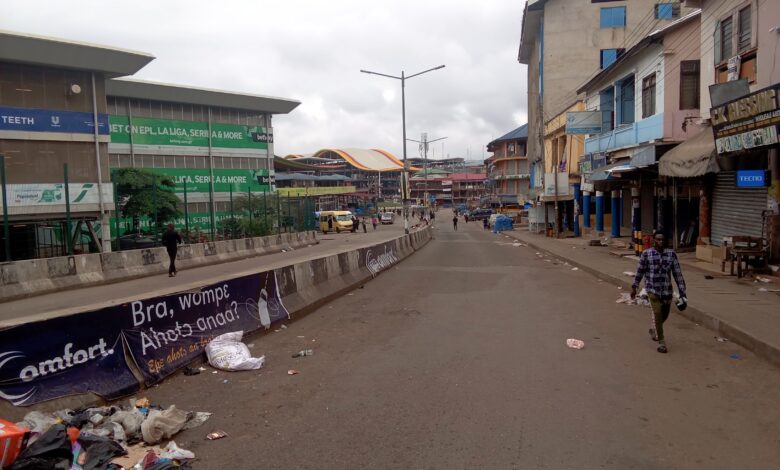 Banks, Shops, stalls, and business centers in Adum — normally one of the busiest trading zones in the Ashanti Region — remained closed. The usually crowded streets, filled with hawkers, customers, and heavy traffic, were eerily quiet, creating a rare spectacle of silence in the heart of Kumasi.