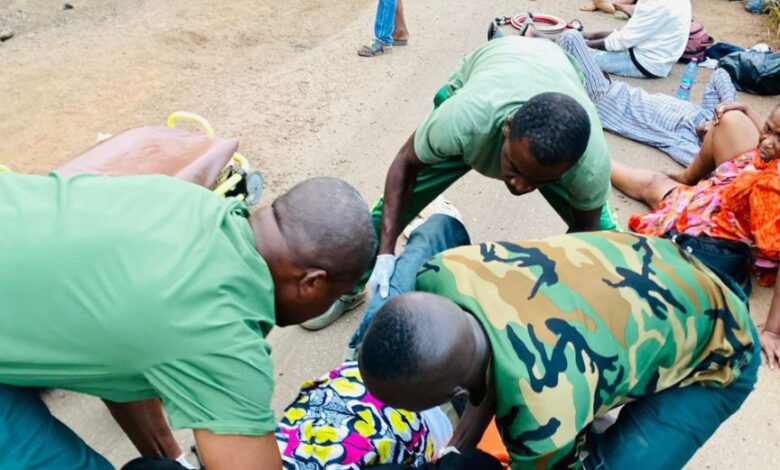 The accident, which occurred around 5:38 a.m. at Nyamebekyere, involved a Ford Transit (AS 7172-23) and a Kia Rhino (AS 3058-X). An eight-member rescue team led by STNO II Simon Yeboah arrived promptly to extricate all occupants—fourteen (14) from the Ford Transit and two (2) aboard the Kia Rhino.