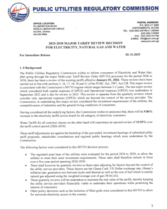 The Public Utilities Regulatory Commission (PURC) has approved new electricity and water tariffs to take effect from January 1, 2026, as part of its 2026–2030 multi-year tariff framework.