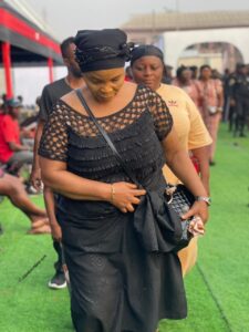 A highly emotional moment unfolded when Priscilla Ofori Atta, popularly known as Odo Broni, wife of the Abusuapanyin, Kofi Owusu, entered the funeral grounds. As she arrived, mourners chanted her name and waved their hands in solidarity. She was visibly emotional and seen crying as security personnel escorted her to her seat, drawing loud reactions from the crowd.